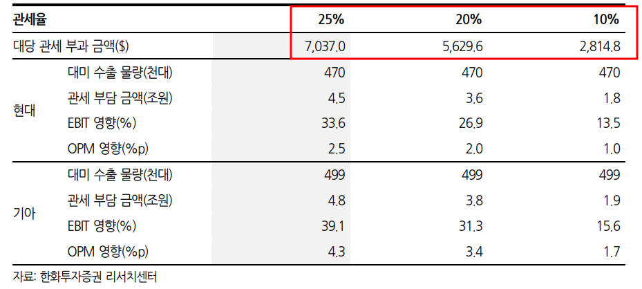 현대차는 미국에 연간 약 47만대를 수출합니다. 대당 25% 관세가 적용되면 약 7,000달러(약 1,000만 원)의 이익이 훼손되어 총 4.5조 원 손실이 예상됩니다. 이는 전체 영업이익의 약 30%에 달하는 금액입니다.